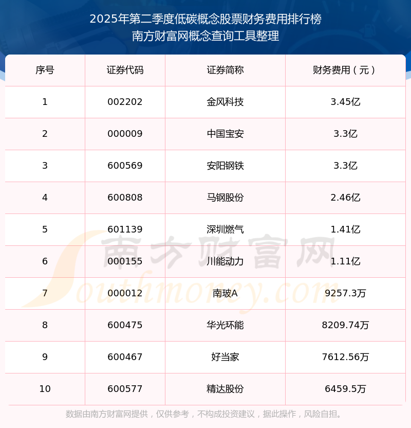 2025年第二季度低碳概念股票财务费用排行榜如下:金风科技(002202)的财务费用总额高达3.45亿,中国宝安(000009)和安阳钢铁(600569)分别排名第二和第三,马钢股份(600808)、深圳燃气(601139)、川能动力(000155)、南玻A(000012)、华光环能(600475)、好当家(600467)、精达股份(600577)分别进入前十,其财务费用总额分别排名第4-10名。