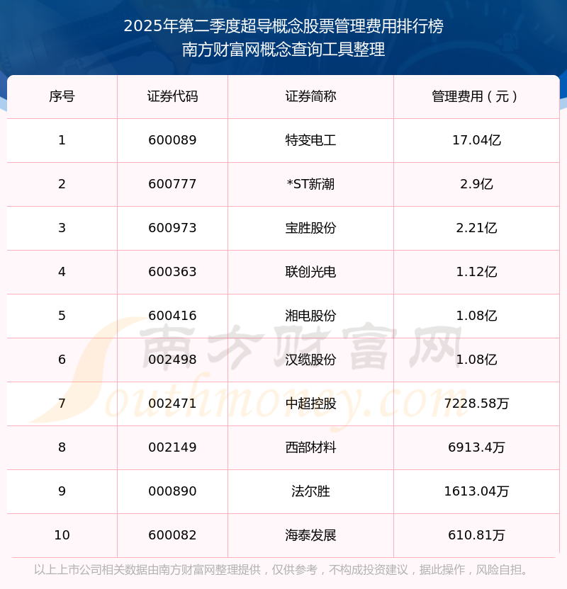 2025年第二季度,超导概念股票管理费用排行榜中,特变电工(600089)的管理费用总额高达17.04亿,*ST新潮(600777)和宝胜股份(600973)分别位居第二和第三,联创光电(600363)、湘电股份(600416)、汉缆股份(002498)、中超控股(002471)、西部材料(002149)、法尔胜(000890)、海泰发展(600082)分别进入前十,其管理费用总额分别排名第4-10名。