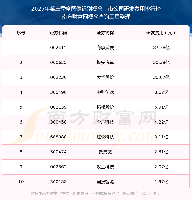 2025年第三季度图像识别概念上市公司研发费用排行榜如下:海康威视(002415)研发费用总额高达87.38亿,长安汽车(000625)和大华股份(002236)分别排名第二和第三,中科创达(300496)、拓邦股份(002139)、全志科技(300458)、虹软科技(688088)、景嘉微(300474)、汉王科技(002362)、国投智能(300188)分别进入前十,其研发费用总额分别排名第4-10名。