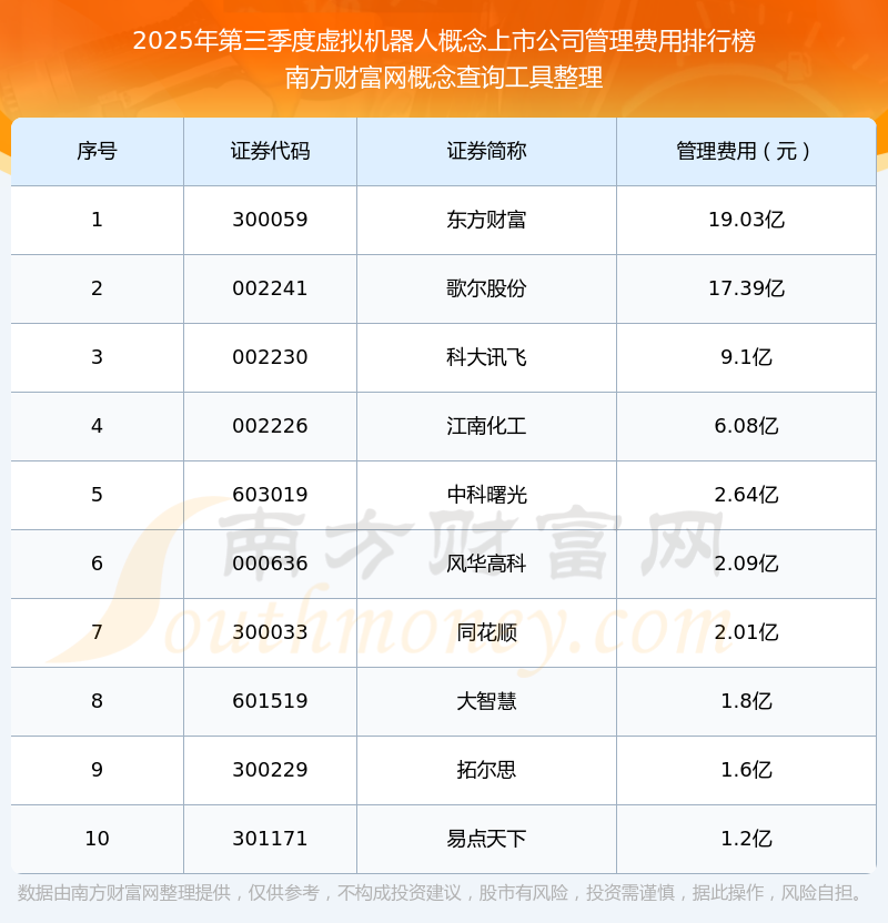 2025年第三季度,虚拟机器人概念上市公司管理费用排名如下:东方财富(300059)的管理费用总额高达19.03亿,歌尔股份(002241)和科大讯飞(002230)位居第二和第三,江南化工(002226)、中科曙光(603019)、风华高科(000636)、同花顺(300033)、大智慧(601519)、拓尔思(300229)、易点天下(301171)分别进入前十,其管理费用总额分别排名第4-10名。