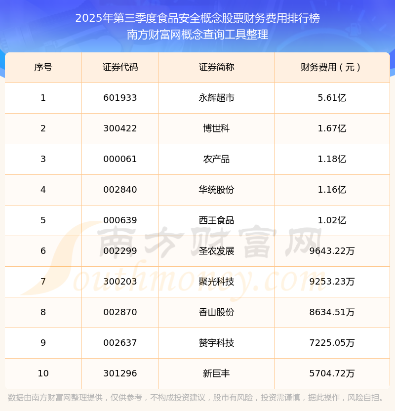 2025年第三季度,食品安全概念股票财务费用排名如下:永辉超市(601933)的财务费用总额高达5.61亿,博世科(300422)和农产品(000061)分别位居第二和第三,华统股份(002840)、西王食品(000639)、圣农发展(002299)、聚光科技(300203)、香山股份(002870)、赞宇科技(002637)、新巨丰(301296)分别进入前十,其财务费用总额分别排名第4-10名。