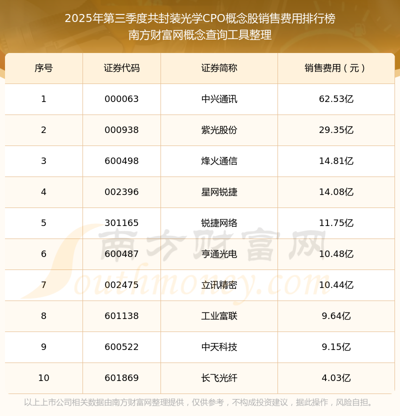 2025年第三季度共封装光学CPO概念股销售费用排行榜如下:中兴通讯(000063)的销售费用总额高达62.53亿,紫光股份(000938)和烽火通信(600498)分别位居第二和第三,星网锐捷(002396)、锐捷网络(301165)、亨通光电(600487)、立讯精密(002475)、工业富联(601138)、中天科技(600522)、长飞光纤(601869)分别进入前十,其销售费用总额分别排名第4-10名。