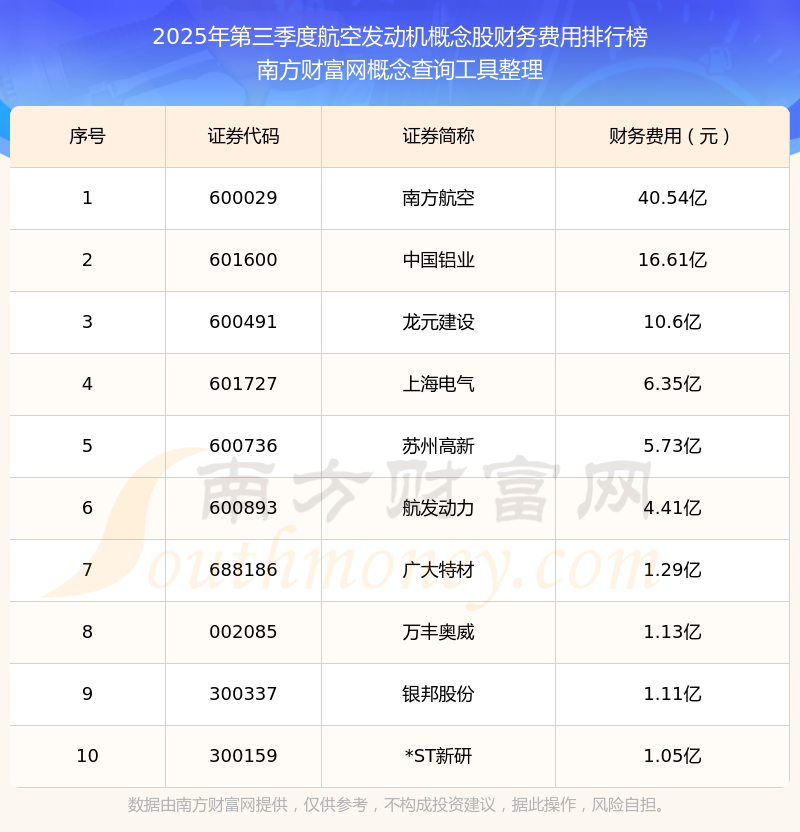 2025年第三季度,航空发动机概念股财务费用排名如下:南方航空(600029)的财务费用总额高达40.54亿,中国铝业(601600)和龙元建设(600491)分别位居第二和第三,上海电气(601727)、苏州高新(600736)、航发动力(600893)、广大特材(688186)、万丰奥威(002085)、银邦股份(300337)、*ST新研(300159)分别进入前十,其财务费用总额分别排名第4-10名。