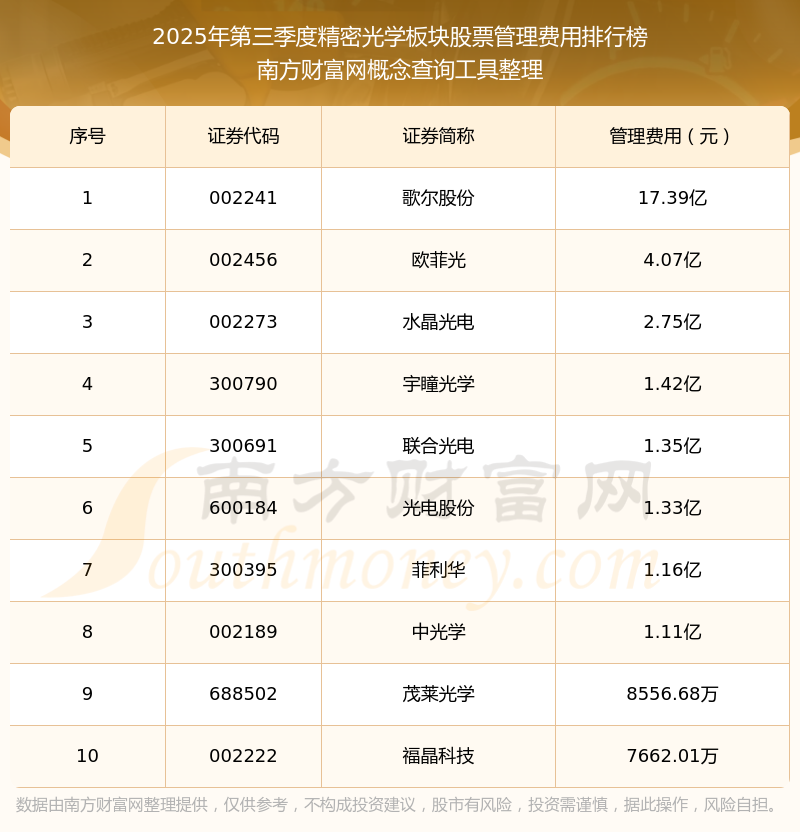 2025年第三季度,精密光学板块股票管理费用排名如下:歌尔股份(002241)的管理费用总额高达17.39亿,欧菲光(002456)和水晶光电(002273)位居第二和第三,宇瞳光学(300790)、联合光电(300691)、光电股份(600184)、菲利华(300395)、中光学(002189)、茂莱光学(688502)、福晶科技(002222)分别进入前十,其管理费用总额分别排名第4-10名。