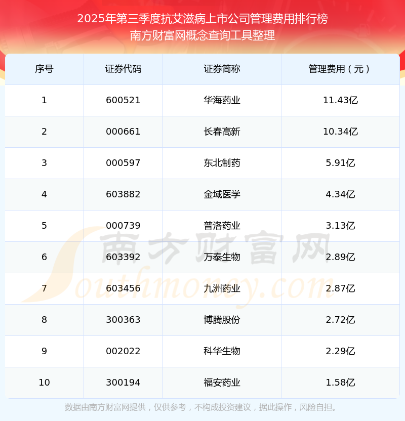 2025年第三季度,抗艾滋病上市公司管理费用排名中,华海药业(600521)的管理费用总额高达11.43亿,长春高新(000661)和东北制药(000597)排名第二和第三,金域医学(603882)、普洛药业(000739)、万泰生物(603392)、九洲药业(603456)、博腾股份(300363)、科华生物(002022)、福安药业(300194)进入前十,其管理费用总额分别排名第4-10名。