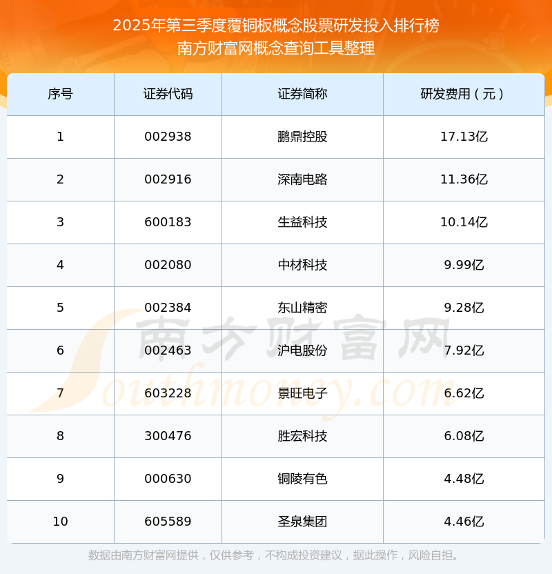 2025年第三季度,覆铜板概念概念股票研发投入排行榜中,鹏鼎控股(002938)研发投入总额高达17.13亿,深南电路(002916)和生益科技(600183)位居第二和第三,中材科技(002080)、东山精密(002384)、沪电股份(002463)、景旺电子(603228)、胜宏科技(300476)、铜陵有色(000630)、圣泉集团(605589)进入前十,研发投入总额分别排名第4-10名。