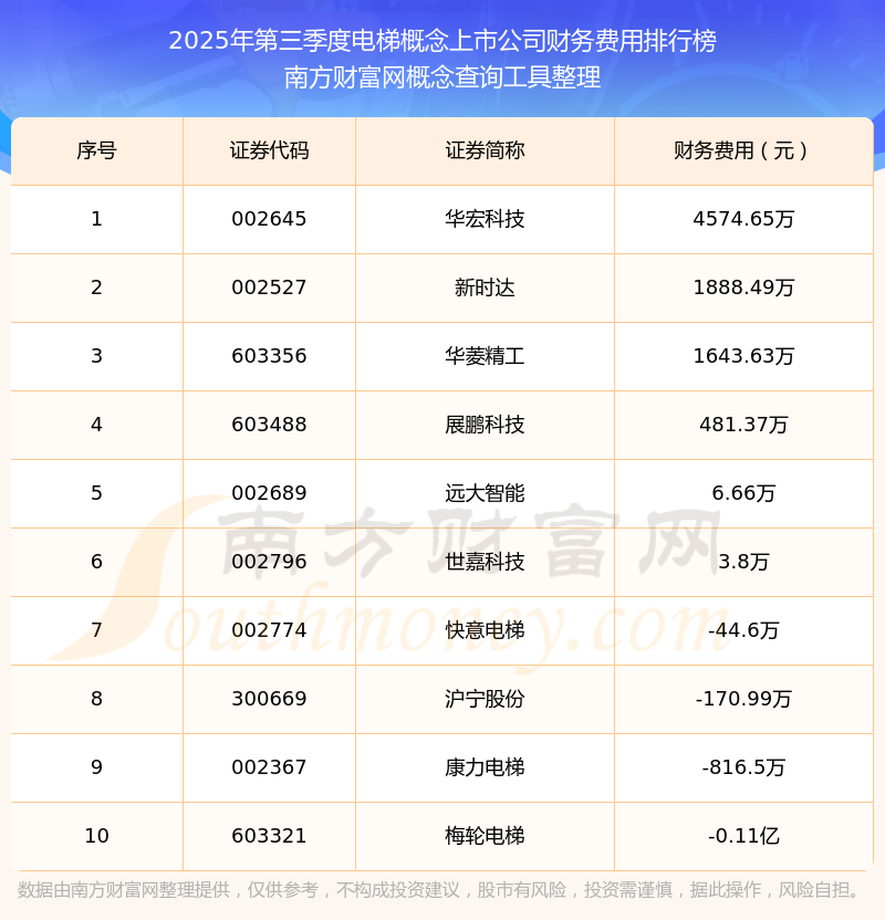 2025年第三季度,电梯概念概念上市公司财务费用排行榜中,华宏科技(002645)财务费用总额高达4574.65万,新时达(002527)和华菱精工(603356)排名第二和第三,展鹏科技(603488)、远大智能(002689)、世嘉科技(002796)、快意电梯(002774)、沪宁股份(300669)、康力电梯(002367)、梅轮电梯(603321)进入前十,财务费用总额分别排名第4-10名。
