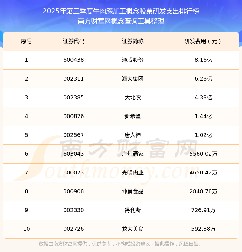 2025年第三季度,牛肉深加工概念股票研发支出排行榜中,通威股份(600438)研发支出总额高达8.16亿,海大集团(002311)和大北农(002385)排名第二和第三,新希望(000876)、唐人神(002567)、广州酒家(603043)、光明肉业(600073)、仲景食品(300908)、得利斯(002330)、龙大美食(002726)进入前十,研发支出总额分别排名第4-10名。