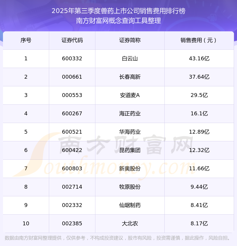 2025年第三季度,兽药上市公司销售费用排行榜中,白云山(600332)销售费用总额高达43.16亿,长春高新(000661)和安道麦A(000553)位居第二和第三,海正药业(600267)、华海药业(600521)、昆药集团(600422)、新奥股份(600803)、牧原股份(002714)、仙琚制药(002332)、大北农(002385)进入前十,销售费用总额分别排名第4-10名。