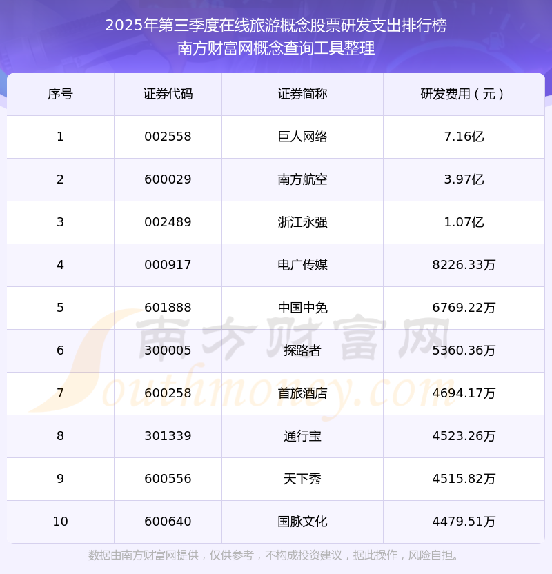 2025年第三季度,在线旅游概念股票研发支出排名如下:巨人网络(002558)研发支出总额高达7.16亿,南方航空(600029)和浙江永强(002489)分别位居第二和第三,电广传媒(000917)、中国中免(601888)、探路者(300005)、首旅酒店(600258)、通行宝(301339)、天下秀(600556)、国脉文化(600640)分别进入前十,其研发支出总额分别排名第4-10名。