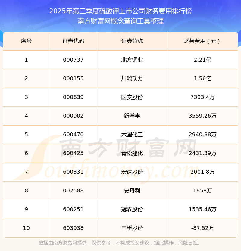2025年第三季度,硫酸钾上市公司财务费用排行榜中,北方铜业(000737)财务费用总额高达2.21亿,川能动力(000155)和国安股份(000839)排名第二和第三,新洋丰(000902)、六国化工(600470)、青松建化(600425)、宏达股份(600331)、史丹利(002588)、冠农股份(600251)、三孚股份(603938)进入前十,财务费用总额分别排名第4-10名。