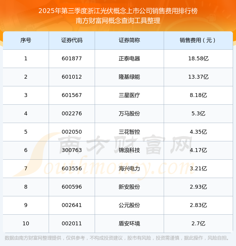 2025年第三季度,浙江光伏概念上市公司销售费用排行榜如下:正泰电器(601877)的销售费用总额高达18.58亿,隆基绿能(601012)和三星医疗(601567)分别位居第二和第三,万马股份(002276)、三花智控(002050)、锦浪科技(300763)、海兴电力(603556)、新安股份(600596)、公元股份(002641)、盾安环境(002011)分别进入前十,其销售费用总额分别排名第4-10名。