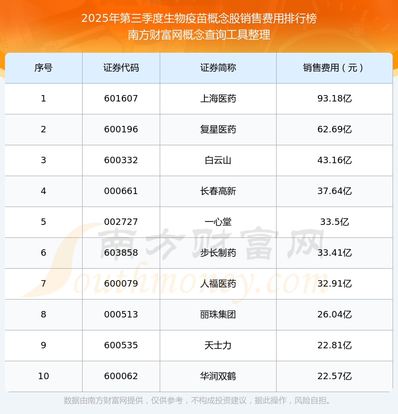 2025年第三季度,生物疫苗概念股销售费用排名中,上海医药(601607)销售费用总额高达93.18亿,复星医药(600196)和白云山(600332)排名第二和第三,长春高新(000661)、一心堂(002727)、步长制药(603858)、人福医药(600079)、丽珠集团(000513)、天士力(600535)、华润双鹤(600062)进入前十,销售费用总额分别排名第4-10名。