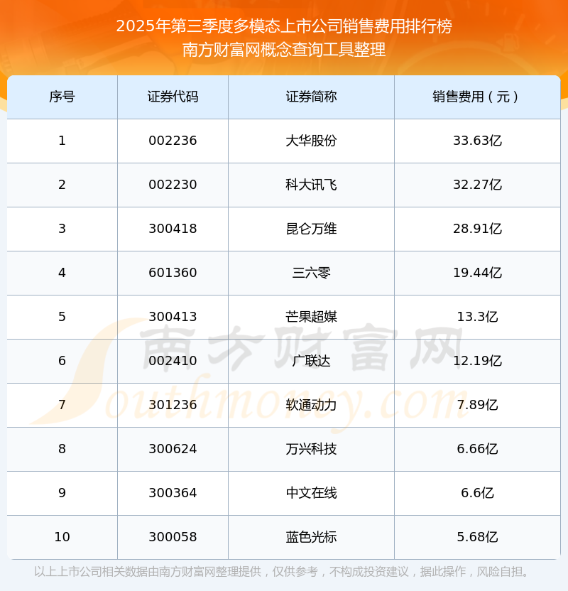 2025年第三季度,多模态上市公司销售费用排行榜如下:大华股份(002236)的销售费用总额高达33.63亿,科大讯飞(002230)和昆仑万维(300418)分别位居第二和第三,三六零(601360)、芒果超媒(300413)、广联达(002410)、软通动力(301236)、万兴科技(300624)、中文在线(300364)、蓝色光标(300058)分别进入前十,其销售费用总额分别排名第4-10名。