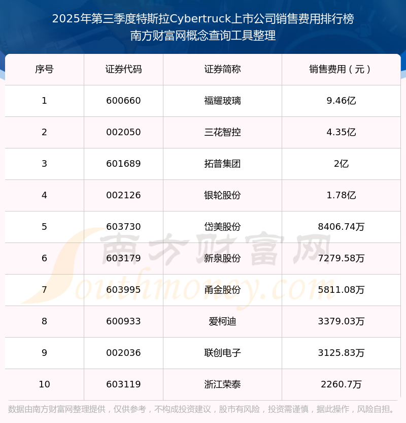 2025年第三季度,特斯拉Cybertruck上市公司销售费用排行榜如下:福耀玻璃(600660)的销售费用总额高达9.46亿,三花智控(002050)和拓普集团(601689)分别位居第二和第三,银轮股份(002126)、岱美股份(603730)、新泉股份(603179)、甬金股份(603995)、爱柯迪(600933)、联创电子(002036)、浙江荣泰(603119)分别进入前十,其销售费用总额分别排名第4-10名。