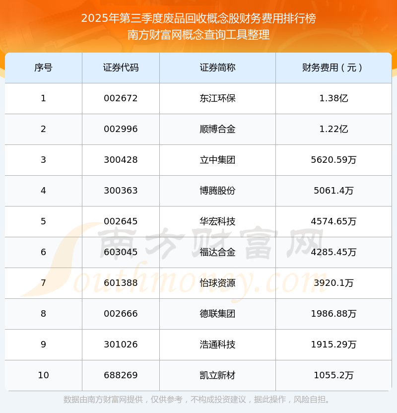 2025年第三季度,废品回收概念股财务费用排行榜中,东江环保(002672)财务费用总额高达1.38亿,顺博合金(002996)和立中集团(300428)位居第二和第三,博腾股份(300363)、华宏科技(002645)、福达合金(603045)、怡球资源(601388)、德联集团(002666)、浩通科技(301026)、凯立新材(688269)进入前十,财务费用总额分别排名第4-10名。