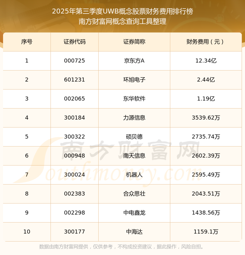 2025年第三季度UWB概念股票财务费用排行榜如下:京东方A(000725)的财务费用总额高达12.34亿,环旭电子(601231)和东华软件(002065)分别排名第二和第三,力源信息(300184)、硕贝德(300322)、南天信息(000948)、机器人(300024)、合众思壮(002383)、中电鑫龙(002298)、中海达(300177)分别进入前十,其财务费用总额分别排名第4-10名。