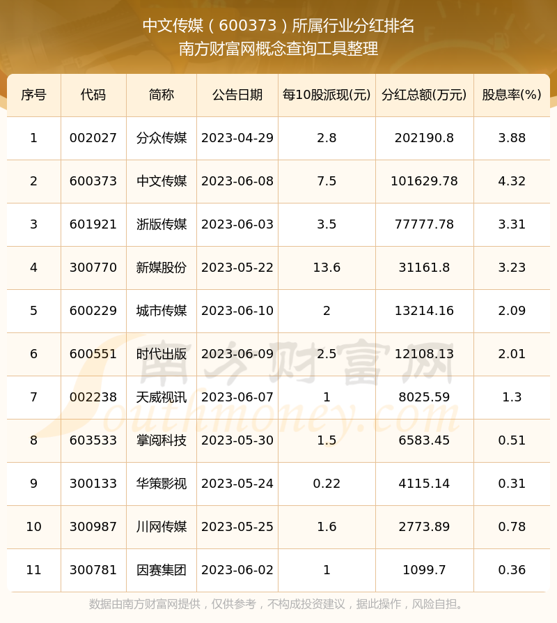按照开云手机web版登录入口趋势选股系统统计,中文传媒所属行业为文化传媒行业,文化传媒行业分红排名情况如下表: