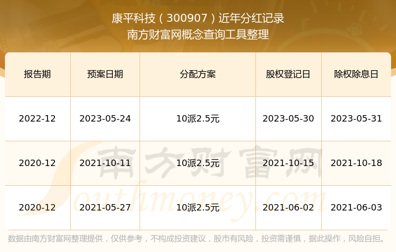康平科技最新一次公布的分红方案为10派2.5元。本次权益分派股权登记日为2023年5月30日,除权除息日为2023年5月31日,派息日为2023年5月31日。