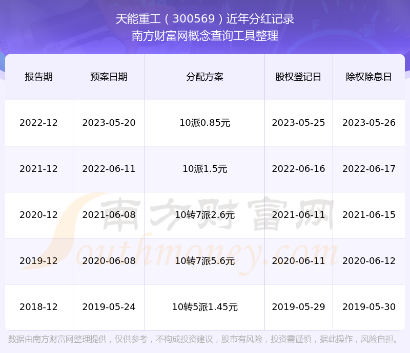 天能重工最新一次公布的分红方案为10派0.85元。本次权益分派股权登记日为2023年5月25日,除权除息日为2023年5月26日,派息日为2023年5月26日。