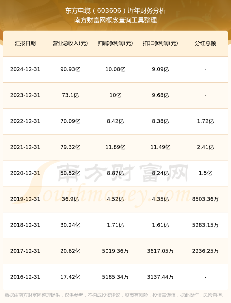 东方电缆公司2024年实现营收90.93亿元,净利润10.08亿元,毛利率18.83%。