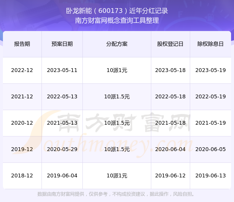 卧龙新能最新一次公布的分红方案为10派1元。本次权益分派股权登记日为2023年5月18日,除权除息日为2023年5月19日,派息日为2023年5月19日。