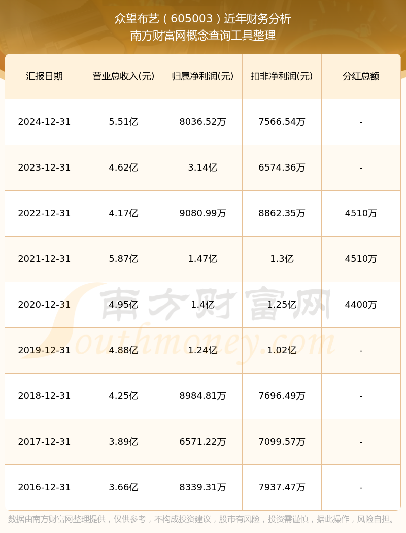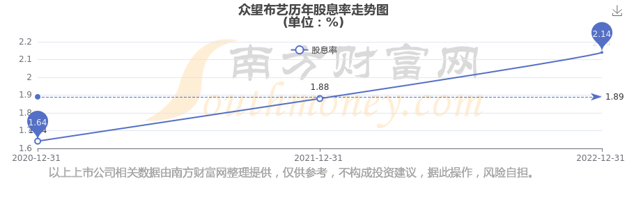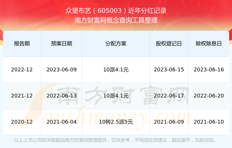 众望布艺最新一次公布的分红方案为10派4.1元。本次权益分派股权登记日为2023年6月15日,除权除息日为2023年6月16日,派息日为2023年6月16日。