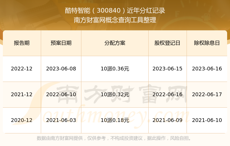 酷特智能最新一次公布的分红方案为10派0.36元。本次权益分派股权登记日为2023年6月15日,除权除息日为2023年6月16日,派息日为2023年6月16日。
