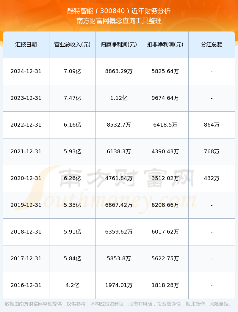2024年酷特智能总营收7.09亿,同比增长-5.14%;净利润8863.29万,同比增长-20.71%;销售毛利率40.17%。
