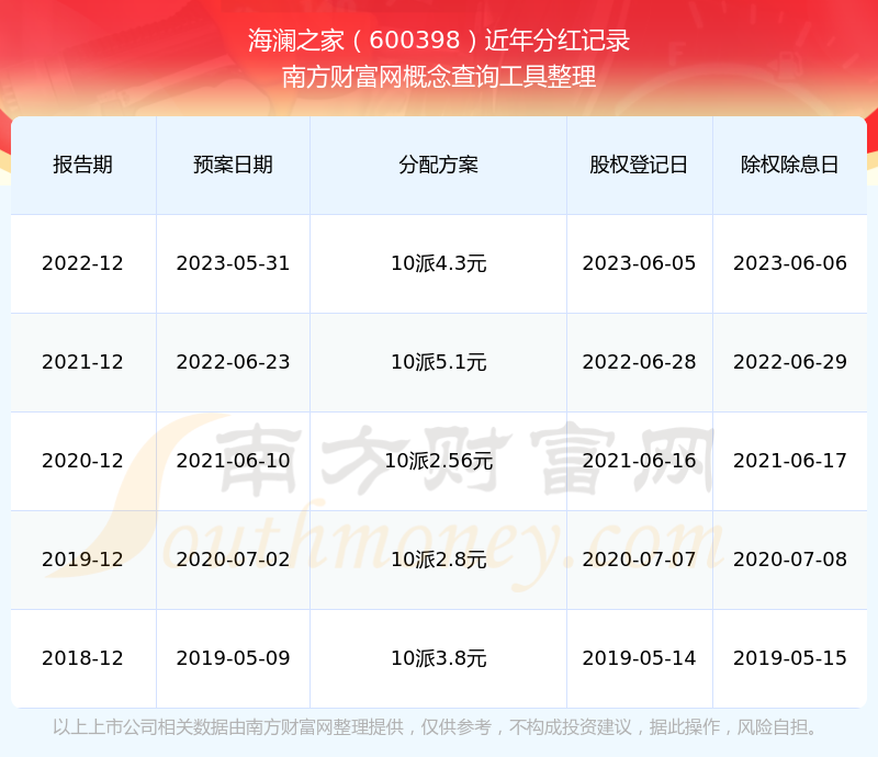 海澜之家最新一次公布的分红方案为10派4.3元。本次权益分派股权登记日为2023年6月5日,除权除息日为2023年6月6日,派息日为2023年6月6日。