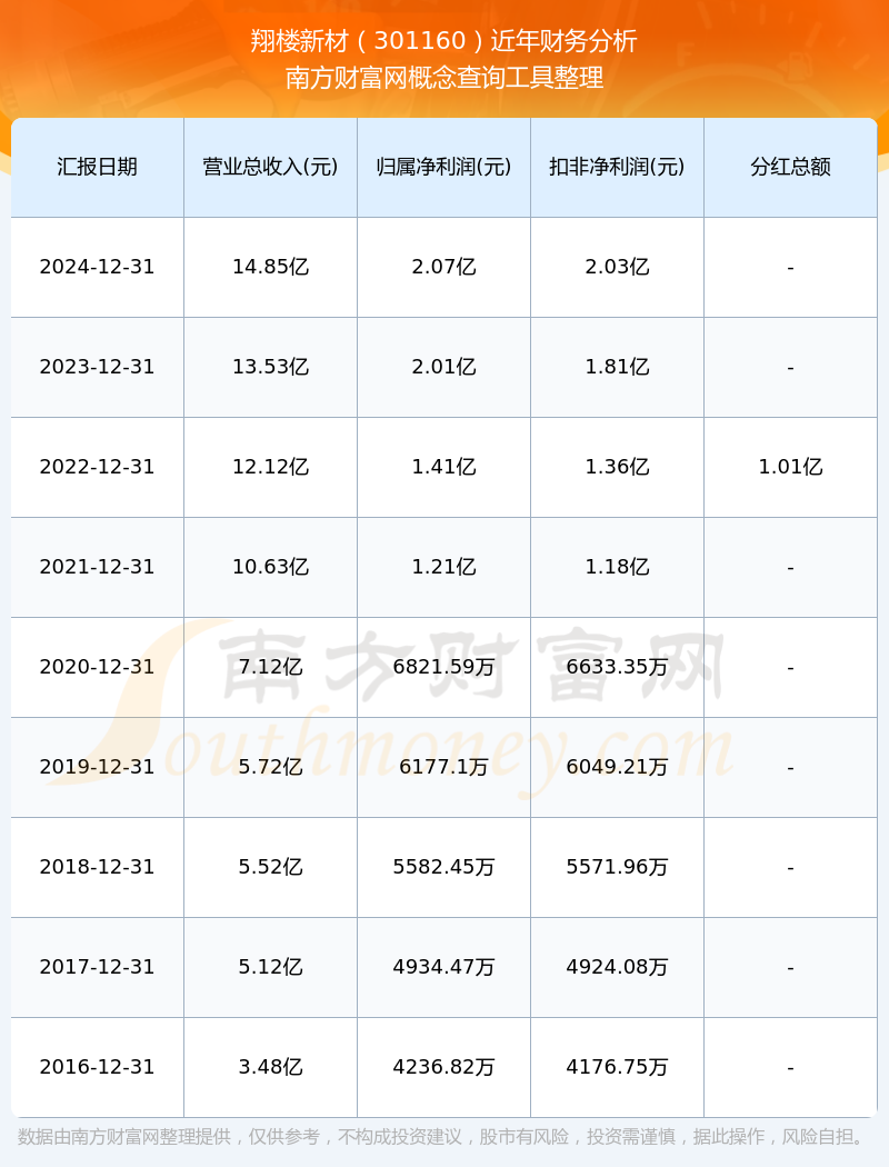翔楼新材公司2024年实现营业收入14.85亿元,同比增长9.74%;净利润2.07亿元,同比增长3.1%;毛利率25.75%。