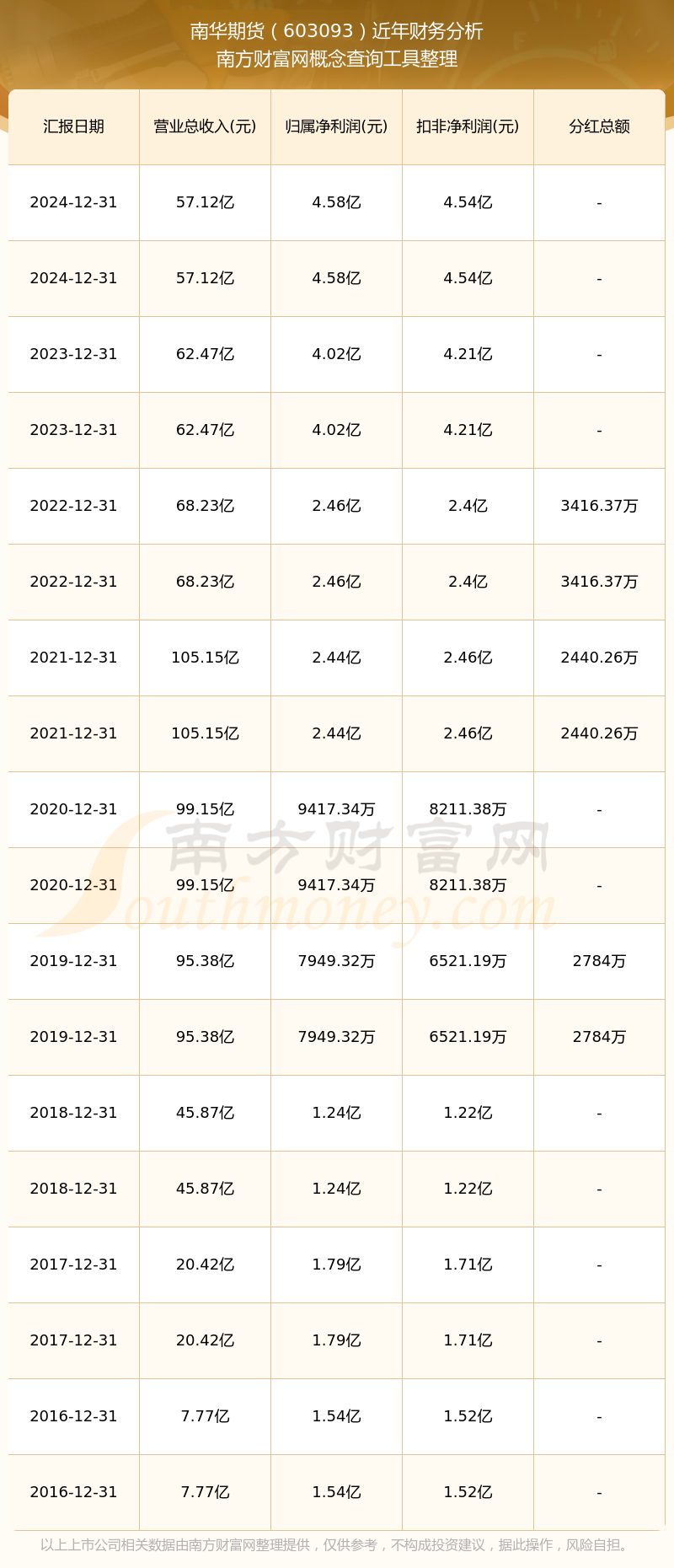 2024年报显示,南华期货实现营收57.12亿,同比增长-8.56%;净利润4.58亿。
