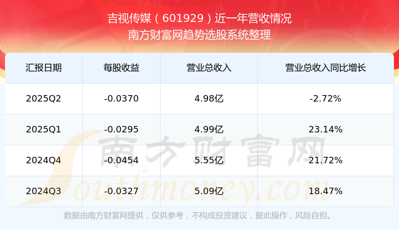 吉视传媒2025年第二季度显示,公司主营收入4.98亿元,同比-2.72%;归母净利润-1.29亿元,同比-65.1%;扣非净利润-1.2亿元,同比-58.62%。
