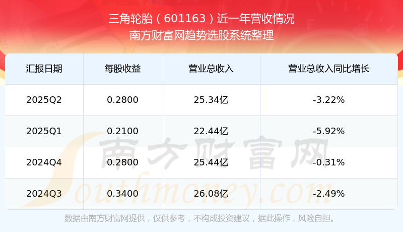 A股上市公司三角轮胎(代码:601163)发布2025年第二季度财报,公司2025年第二季度归属于上市公司股东的净利润为2.3亿元,净利润同比增长-27.71%,环比增长38.45%。