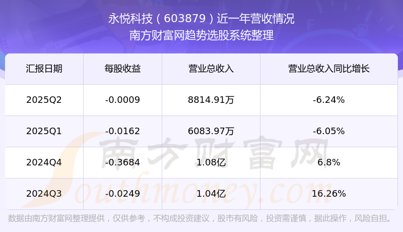 财报显示,2025年第二季度永悦科技营收8814.91万元,同比增长-6.24%,净利润-33.79万元,同比增长97.35%。