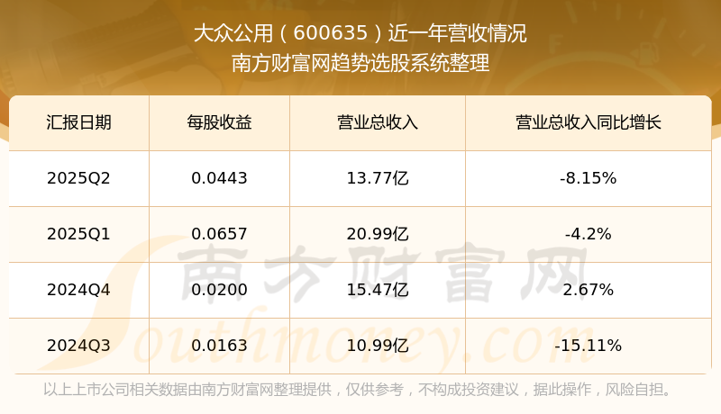 大众公用2025年第二季度财报显示,公司主营收入13.77亿元,同比-8.15%;归母净利润1.39亿元,同比47.02%;扣非净利润1.56亿元,同比107.35%;