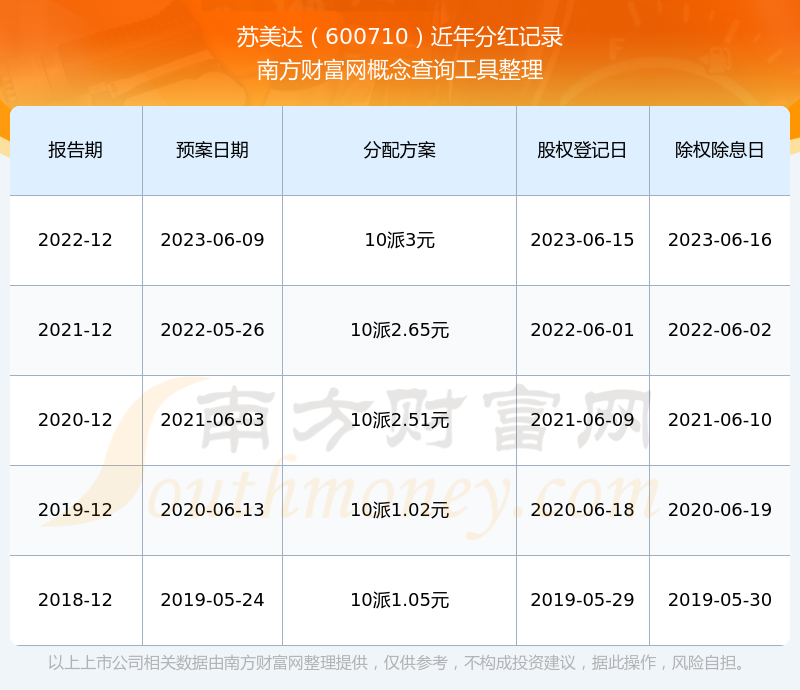 苏美达最新一次公布的分红方案为10派3元。本次权益分派股权登记日为2023年6月15日,除权除息日为2023年6月16日,派息日为2023年6月16日。