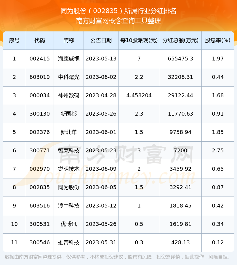按照开云手机web版登录入口趋势选股系统统计,同为股份所属行业为视频监控行业,视频监控行业分红排名情况如下表: