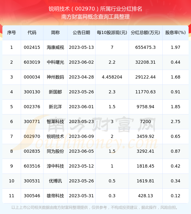 按照开云手机web版登录入口趋势选股系统统计,锐明技术所属行业为计算机设备行业,计算机设备行业分红排名情况如下表: