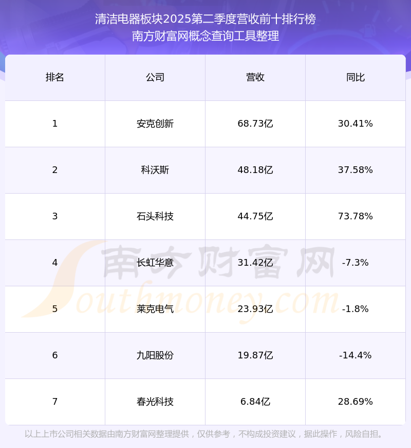 按照开云手机web版登录入口概念查询工具统计,该股所属板块为清洁电器板块,该板块共有7只股票,春光科技2025第二季度营收在该板块中排名为第7名,该板块2025第二季度营收排名前十的股票如下表: