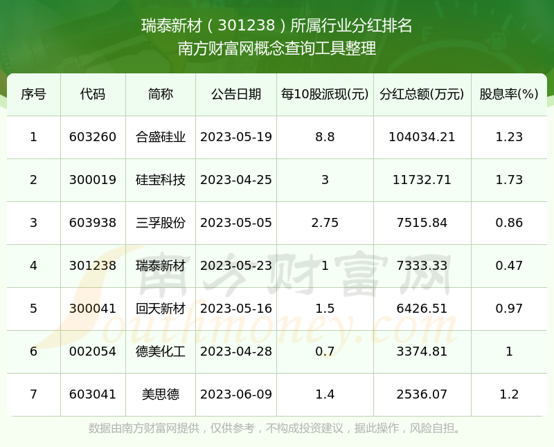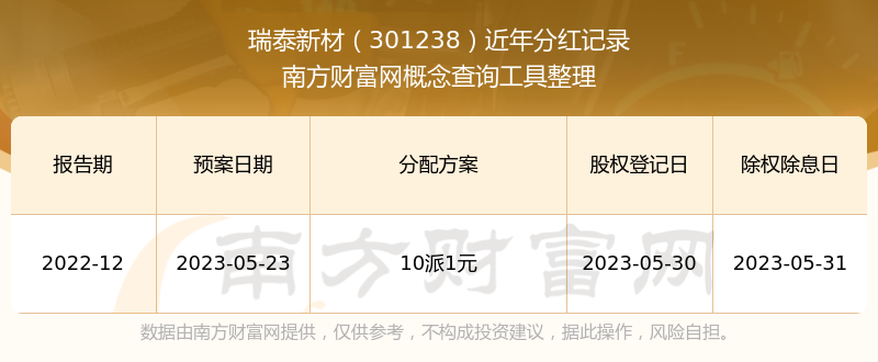 瑞泰新材最新一次公布的分红方案为10派1元。本次权益分派股权登记日为2023年5月30日,除权除息日为2023年5月31日,派息日为2023年5月31日。