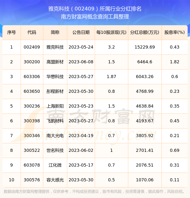 按照开云手机web版登录入口趋势选股系统统计,雅克科技所属行业为光刻胶行业,光刻胶行业分红排名情况如下表: