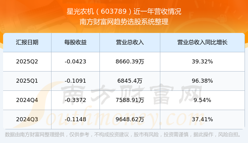 在2025年第二季度,星光农机的业绩表现,主营业务收入达到8660.39万元,实现了39.32%的同比增长率。同时,公司归母净利润录得-1256.72万元,同比增长51.29%。