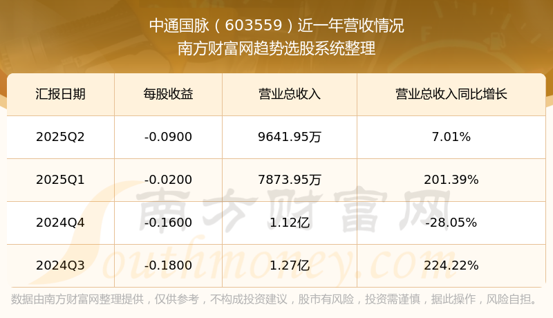 中通国脉(603559)披露2025年第二季度报告,报告期实现营收9641.95万元,同比7.01%;归母净利润-3457.8万元,同比28.93%;扣非净利润-3349.17万元,同比-52.02%。