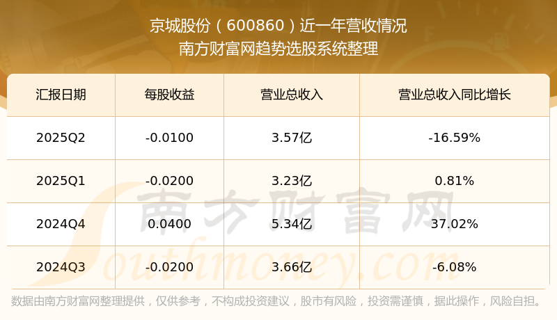 京城股份2025年第二季度显示,公司主营收入3.57亿元,同比-16.59%;归母净利润-384.51万元,同比-222.14%;扣非净利润-904.78万元,同比-162.62%。