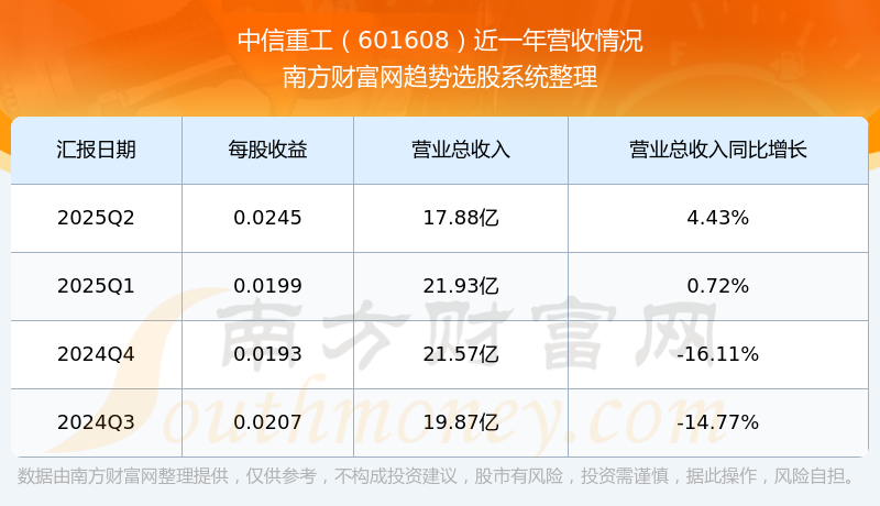 中信重工2025年第二季度财报显示,公司主营收入17.88亿元,同比4.43%;归母净利润1.12亿元,同比10.92%;扣非净利润1.09亿元,同比22.69%;
