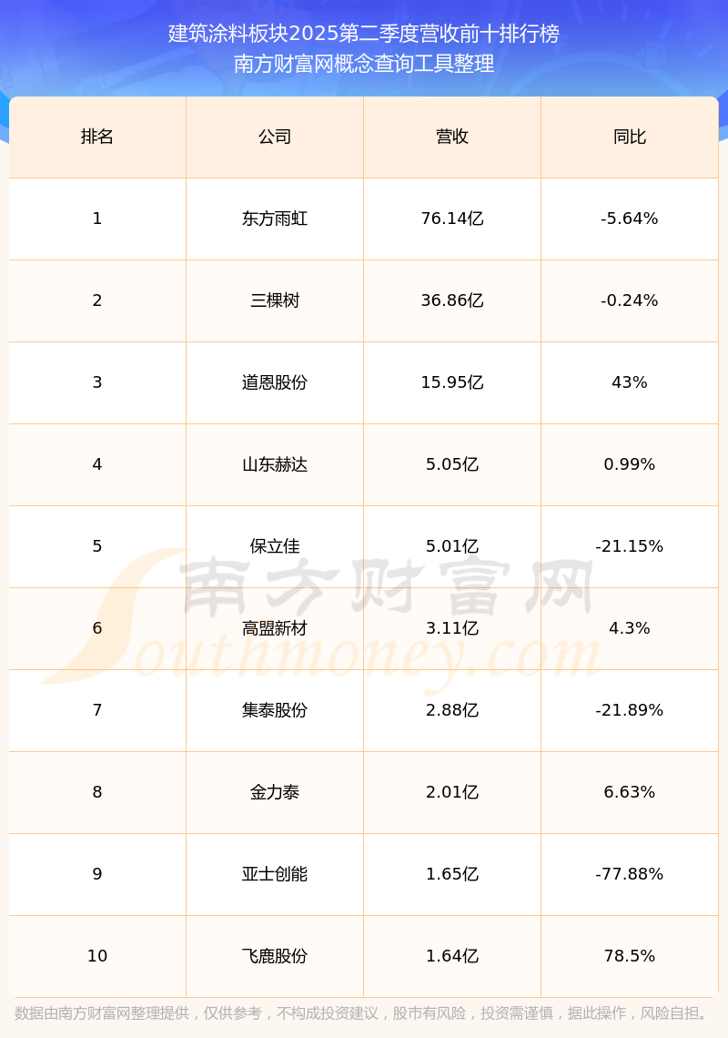 按照开云手机web版登录入口概念查询工具统计,该股所属板块为建筑涂料板块,该板块共有11只股票,亚士创能2025第二季度营收在该板块中排名为第9名,该板块2025第二季度营收排名前十的股票如下表: