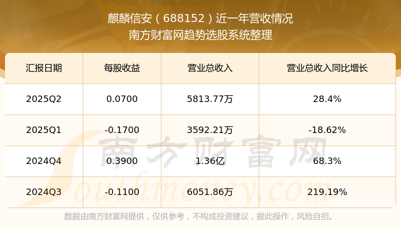 麒麟信安披露了2025年第二季度财报。报告显示,麒麟信安2025年第二季度实现营收5813.77万元,同比28.4%;归母净利润329.72万元,同比145.34%。