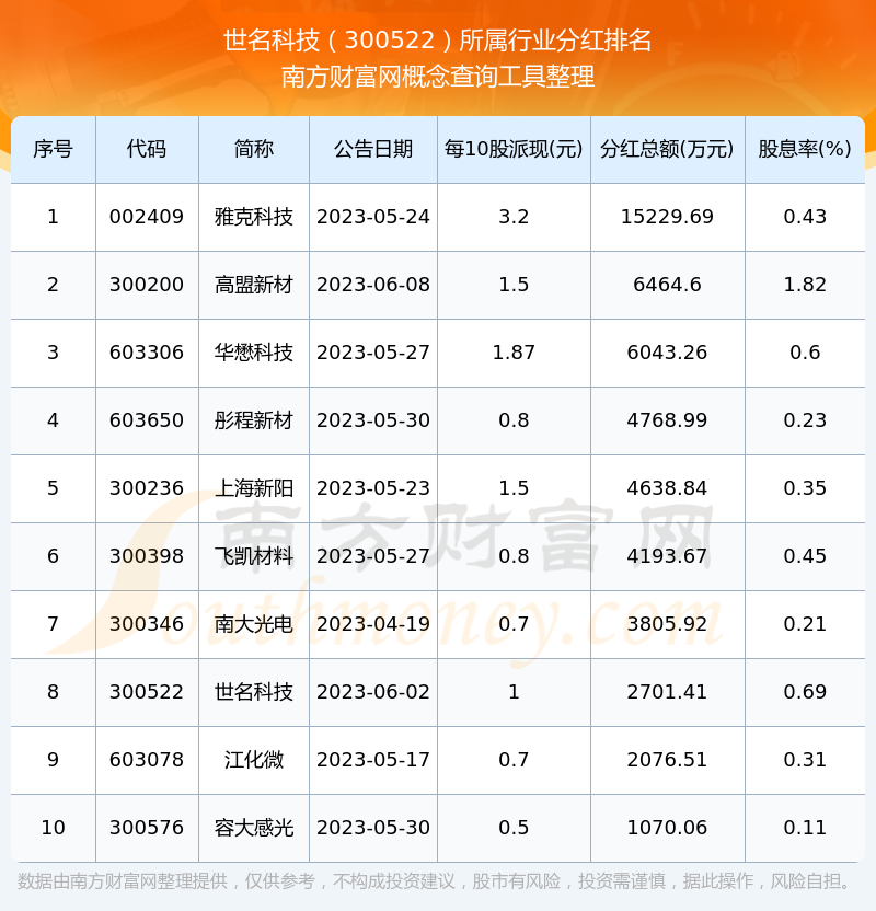 二、世名科技300522行业分红排名