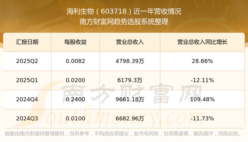 海利生物2025年第二季度显示,公司主营收入4798.39万元,同比28.66%;归母净利润733.31万元,同比-61.09%;扣非净利润627.03万元,同比181.02%;